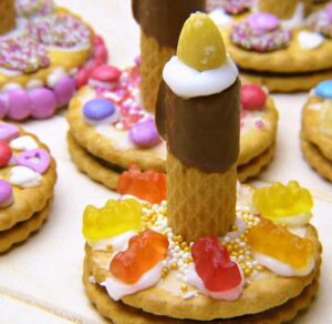 Und dann braucht ihr nur noch verschiedene Süßigkeiten, um die Kekse zu dekorieren! Dabei sind eurer Fantasie keine Grenzen gesetzt!
